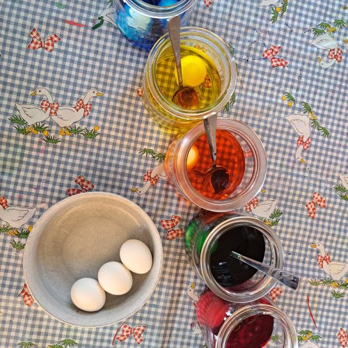 Heute haben die Krippenkinder dem Osterhasen beim färben der Eier...